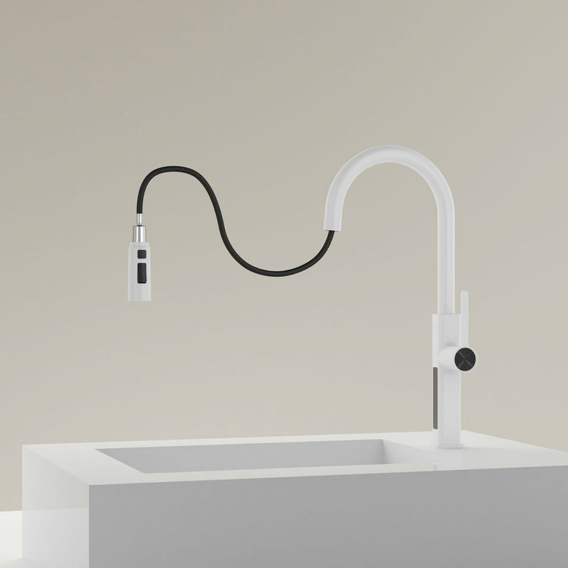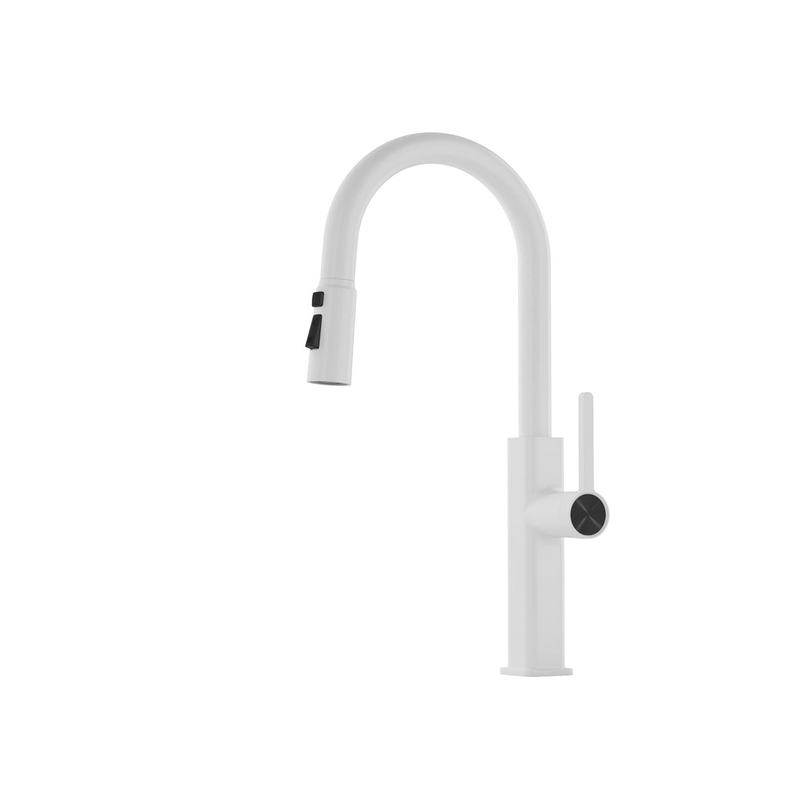 The commercial white pull down kitchen faucet with separate handle provides soft aerated stream and splash-free powerful spray due to its hard rubber sprayer holes. easily to clean dishes and sinks.